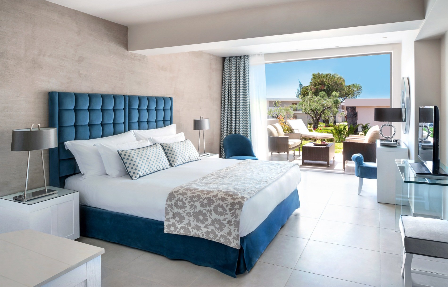 Als Gast dieser ebenfalls im Hauptgebäude gelegenen 30-Quadratmeter-Zimmer für bis zu zwei Erwachsene und ein Kind darf man sich auf ein stillvolles Ambiente mit modernen Designelementen freuen. Zur Ausstattung zählen geräumige Sitzbereiche, ein edles Bad mit Regendusche und ein möblierter Balkon mit himmlischer Aussicht auf die gepflegten Gärten oder glitzernden Wellen.