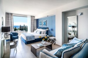 Das perfekt geschnittene und zeitgemäß gestaltete 37-Quadratmeter-Suite für bis zu vier Personen eröffnet einen fantastischen Panoramablick auf die Ägäis. Zur umfangreichen Ausstattung zählen ein offener Sitzbereich, ein edles Badezimmer mit Regendusche und ein möblierter Balkon.
