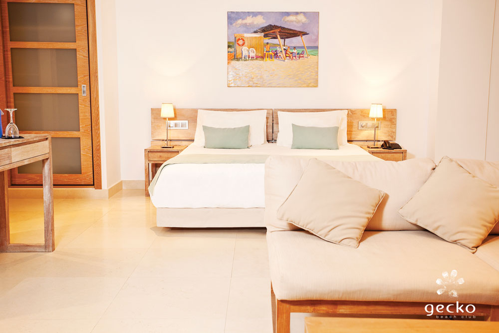 Gecko Levante: Dieses besonders große Zimmer mit eigener Terrasse ist wie geschaffen für Familien oder alle, die einfach ein bisschen mehr Platz brauchen. Es befindet sich direkt am Eingang des Beach Clubs und liegt nur 20 Meter vom wunderschönen Garten entfernt.